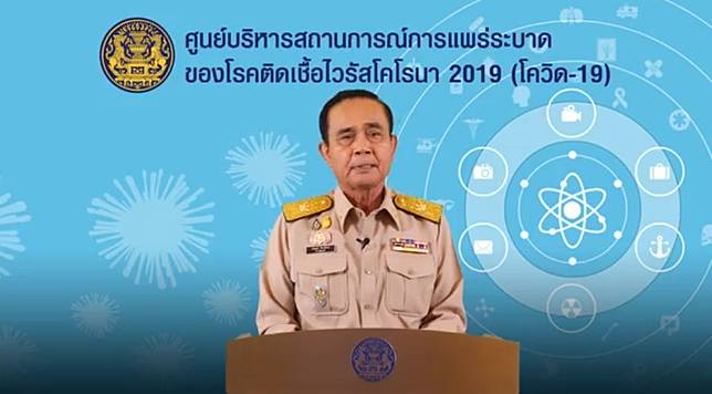 พลอประยทธ จนทรโอชา นายกรฐมนตร แถลงกรณสถานการณการแพรระบาดของเชอไวรสโคโรนา. นายกฯ แถลง พรกฉกเฉนคมโควด-19 หลงมขาวลอประกาศเคอรฟว. จากทง 3 พรรค ในคำวนน เวลา 1900 น.